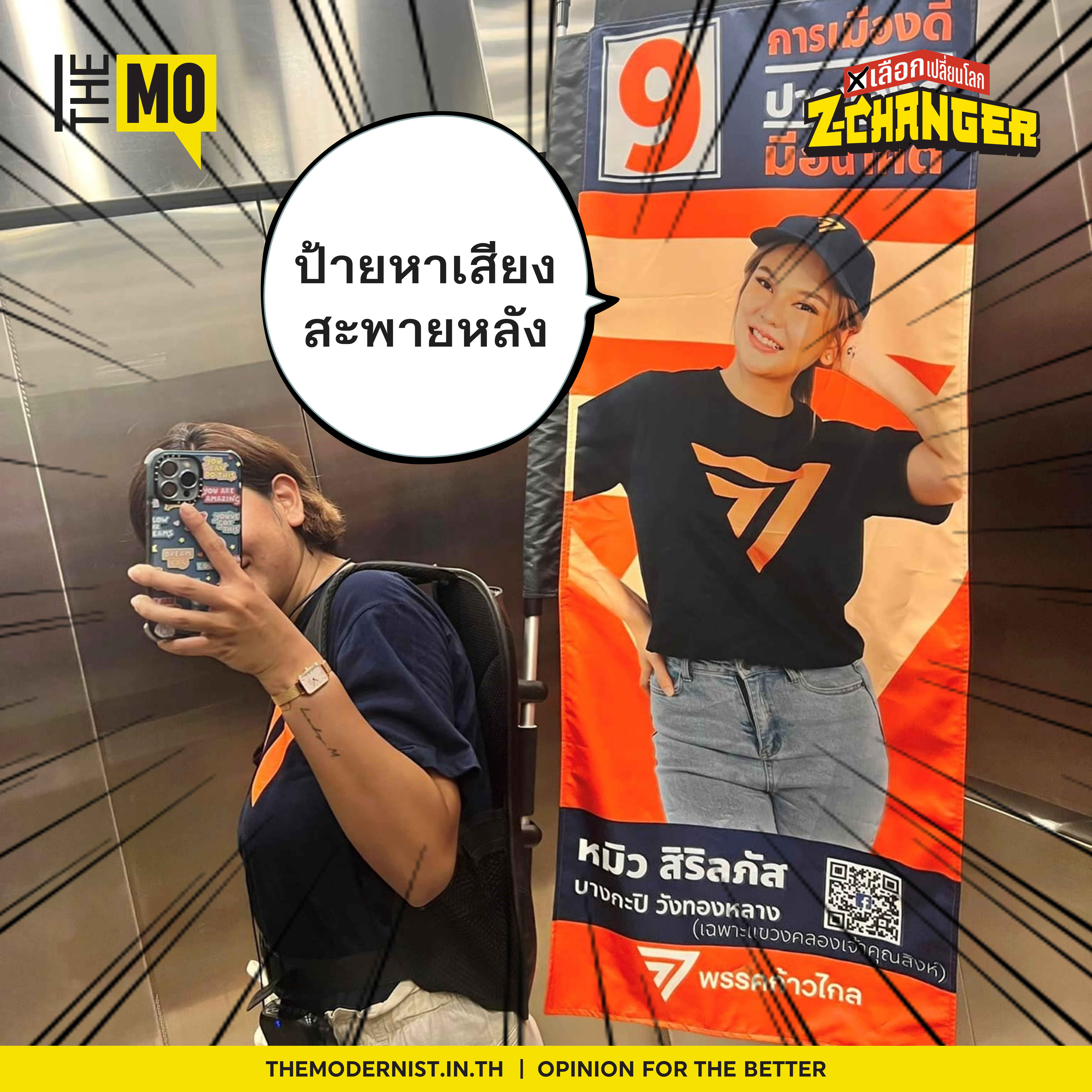 และยิ่งการที่เธอมาสังกัดพรรคก้าวไกล วิธีการหาเสียงของเธอเลยจำเป็นต้องใช้งบประมาณที่น้อยที่สุด เพื่อให้เกิดประสิทธิภาพมากที่สุด ความคิดสร้างสรรค์ในการหาเสียงของหมิวจึงมาตกอยู่ที่ป้ายหาเสียง ด้วยการสะพายป้ายในรูปแบบธงญี่ปุ่นไว้ที่หลังเสียเลย