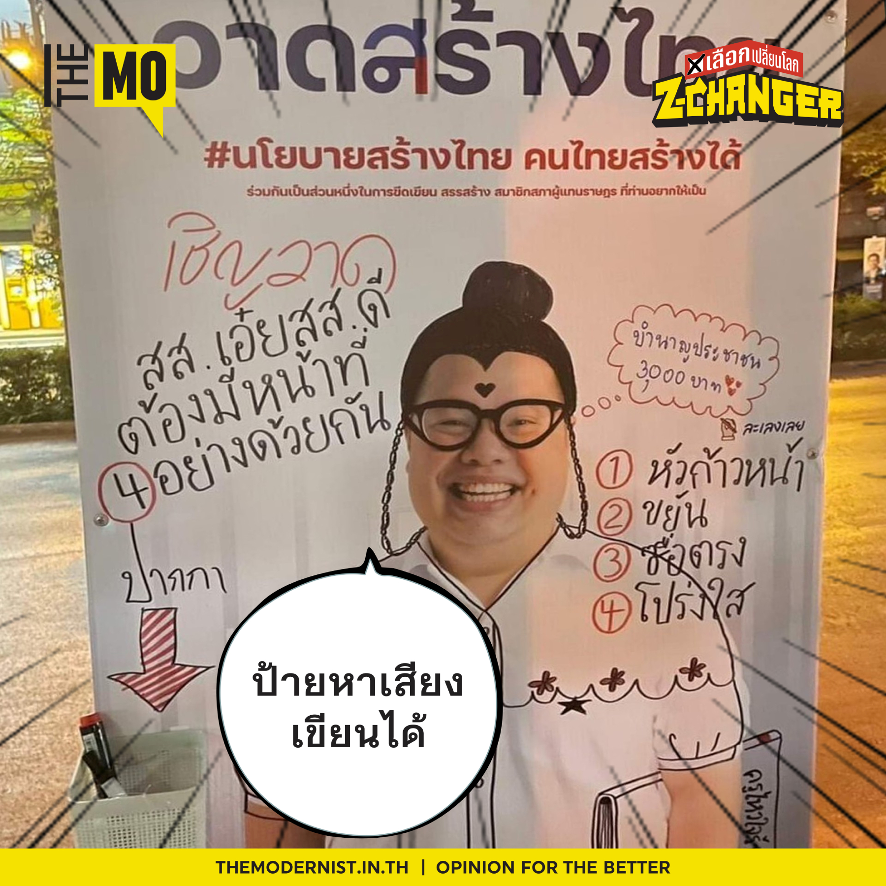 หันไปทางไหนก็เจอแต่ป้ายถูกทำลายเต็มไปหมด โดนกรีดบ้าง โดนพ่นสีใส่บ้าง มีก็แต่เพียงป้ายหาเสียงของ ‘ณัฐวัฒน์ พอใช้ได้’ ส.ส. พรรคไทยสร้างไทย ที่ใส่หัวข้อใหญ่ ๆ ไว้บนป้ายเลยว่า “วาดสร้างไทย” ซึ่งหมายถึงการเปิดพื้นที่ให้ทุกคนได้มีสิทธิ์วาดอะไรก็ได้ลงบนป้ายนี้ ผ่านปากกาเมจิกที่ติดไว้ข้างป้ายหาเสียง